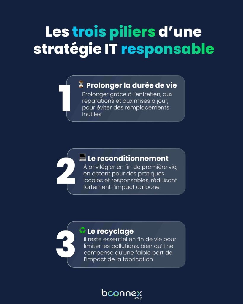 Face à ce constat, les entreprises disposent de leviers concrets pour agir, bien avant d'en arriver au recyclage. La hiérarchie à adopter est claire : prolonger d'abord, reconditionner ensuite, recycler en dernier recours.