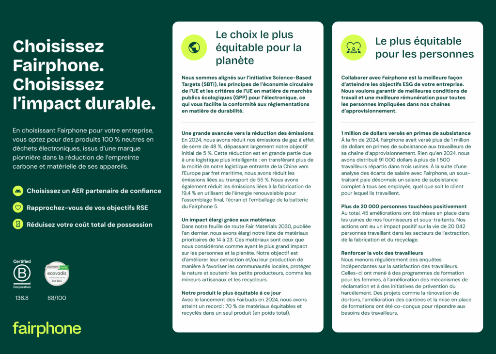 💡 Pour les entreprises, le choix est clair : continuer à subir les cycles courts, coûteux et polluants du mobile… ou adopter une approche durable, qui réduit les coûts, améliore l’image et engage positivement les collaborateurs.