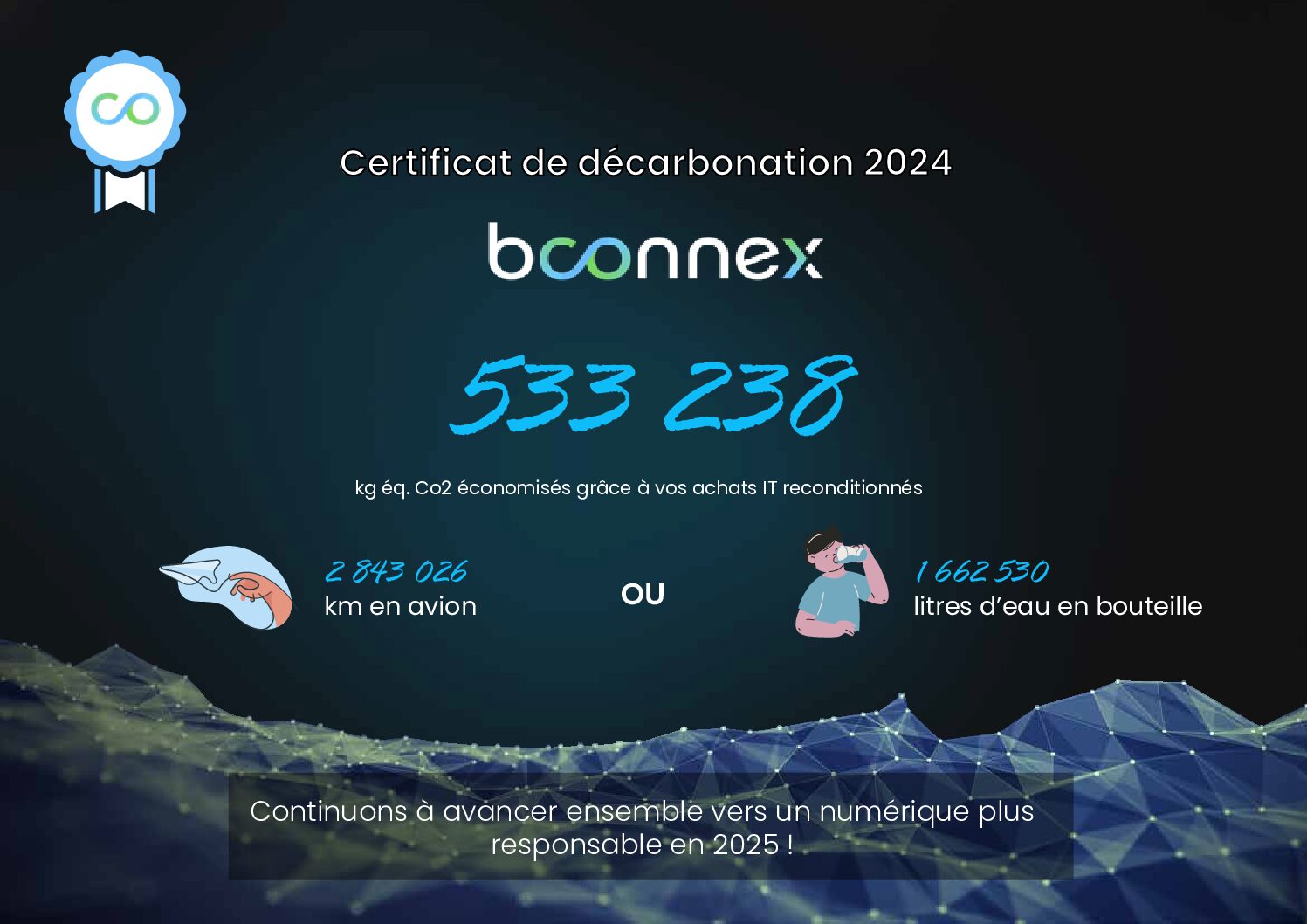 PC, smartphones, tablettes, micros-casques... lorsque vous privilégiez le reconditionné à l’achat du neuf, vous économisez des émissions de CO2. Pour officialiser votre choix d’une consommation plus responsable, le groupe bconnex s’engage à vous remettre des certificats de décarbonation annuels.