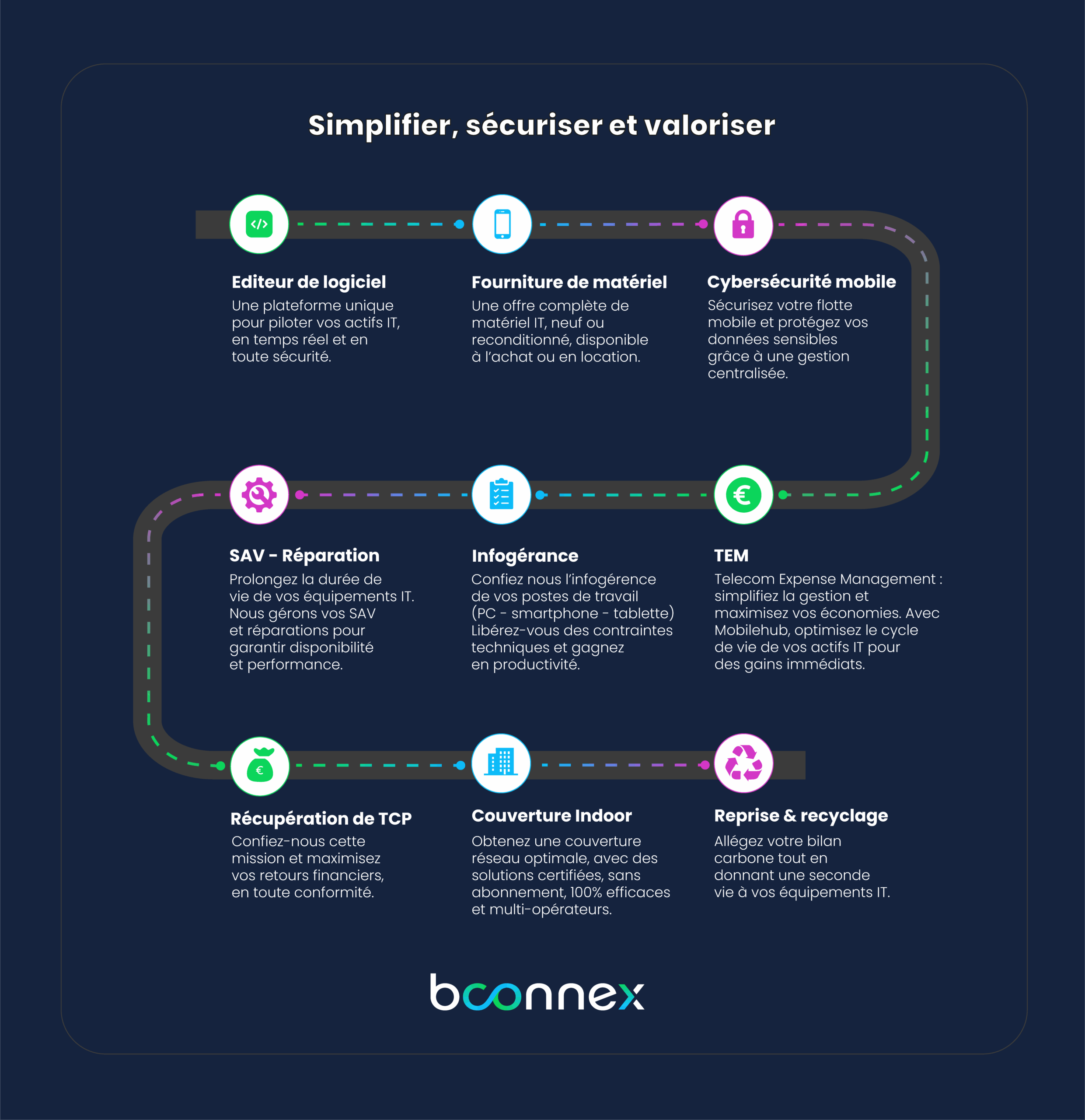 Chez bconnex, nous simplifions la gestion de vos équipements IT à chaque étape de leur cycle de vie. De la fourniture au recyclage, en passant par la cybersécurité mobile, nous vous offrons une solution globale et intégrée pour gagner en sérénité, en productivité et en impact positif. Votre IT devient un levier de performance durable.
